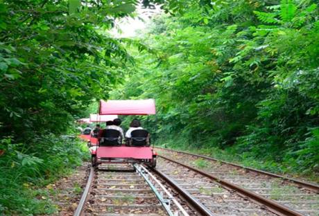 (1)骑行路线:一路风景不重样 江村铁路自行车有多条路线可选,最经典的是 “江村站 - 金裕贞站” 段(单程约 5 公里,往返 10 公里),沿途能解锁 “三重风景”: 山野段:出发后先穿过成片的栗子林,树枝偶尔会掠过车顶,风里带着栗子花的清香(春季)或栗子的甜香(秋季); 江边段:轨道靠近汉江支流,骑行时能看到江水缓缓流淌,远处有渔民划着小船,偶尔有白鹭飞过,像一幅动态的山水图; 隧道段:中途会穿过 “月光隧道”,隧道内布满 LED 灯,灯光随音乐变换颜色(如蓝色星空、粉色花海),骑行其中仿佛穿越 “时光隧道”,浪漫又梦幻。
