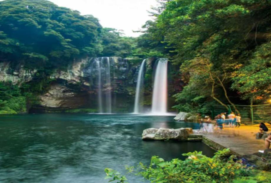 2. 天帝渊瀑布:瀑布与彩虹的治愈邂逅 想感受济州的 “小清新”,天帝渊瀑布是好选择。瀑布分三段,下段瀑布最适合观赏 —— 水流从岩石倾泻而下,溅起的水花在阳光折射下常出现彩虹,因此也叫 “彩虹瀑布”。周围是茂密的亚热带树林,步道平缓,沿途有木桥、凉亭,走累了可坐下来听瀑布声,呼吸新鲜空气,离中文旅游区近,若想搭配购物也很方便。