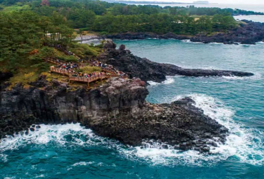 简介:是济州岛闻名海内外的自然景观,由汉拿山火山爆发喷出的岩浆流入海中急速冷却后形成,有一条长达 1000 米的黑色石带,石柱呈四至六角形,高达 40 米。这里波浪汹涌时可高达 10 米以上,惊涛拍岸,蔚为壮观,是济州岛的自然保护对象。从游客中心到观景台需步行 15 分钟,全是台阶,建议下午 4 点后去,以避免晴天反光严重的问题。