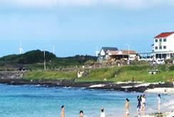 月汀里海水浴场:被誉为 “济州小圣托里尼”,彩色木质桌椅与湛蓝海水形成童话感画面,即便不下水,点杯咖啡看风车与海浪也极具度假感,阴天时海水更显层次丰富的蓝调。