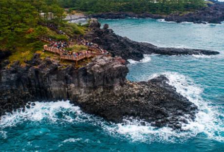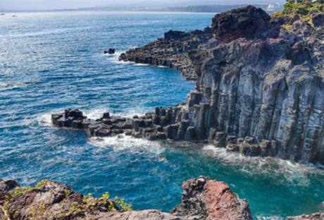 2. 柱状节理带:探索 “火山岩壁” 的地质奇迹 柱状节理带是济州岛最震撼的 “自然奇观” 之一,因火山熔岩冷却后收缩,形成了数百根 “六边形柱状岩石”,整齐排列在海岸边,宛如 “大自然的钢琴键”,被列为济州岛自然保护区域。 核心体验: 岩壁观景:沿着木栈道走到海岸边,能近距离看到柱状节理岩的全貌 —— 岩石呈规则的六边形,垂直排列,高度从数米到数十米不等,海浪拍打着岩壁,发出 “哗哗” 的声响,场面壮观;中文司机会讲解 “柱状节理带的形成过程”(约 140 万年前,济州岛火山喷发,熔岩流入大海,快速冷却后收缩,形成六边形柱状结构),让你了解地质奇迹背后的科学原理。 日出 / 日落观赏:若行程时间允许,司机可调整路线,带你在日出或日落时分前来 —— 日出时,阳光洒在岩壁上,岩石被染成金色;日落时,晚霞与岩壁、蓝海相映,画面格外浪漫,是摄影爱好者的 “必拍场景”。 游玩贴士:海岸边风较大,建议携带薄外套;木栈道部分路段较陡,穿舒适的运动鞋;岩壁区域禁止攀爬,需遵守景区规定,保护自然景观。