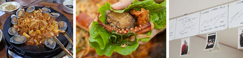 要说最让人惊艳的,当属 “辣炒黑猪肉三合”——“三合” 便是这道菜的灵魂:活蹦乱跳的新鲜鲍鱼、纹理紧实的济州黑猪肉,再加上 Q 弹鲜脆的鱿鱼。厨师用韩式辣椒酱调出香辣够味的酱汁,将三种食材与脆嫩蔬菜一同倒进热平锅翻炒,火候一到,肉香、海鲜鲜与酱料的香辣直往鼻尖钻。吃的时候,用一片水灵的生菜裹住热乎的黑猪肉、弹嫩鲍鱼肉和鱿鱼,一口下去,海鲜的清甜、猪肉的醇香裹着蔬菜的清爽在嘴里炸开,那股子奇妙的鲜香,吃过一次就忘不了!而且一定要记得,吃完锅里的食材,千万别放过锅底的酱汁 —— 点一份米饭倒进去翻炒,每一粒米都吸满了鲜辣滋味,妥妥的 “隐藏彩蛋”,不吃绝对亏!