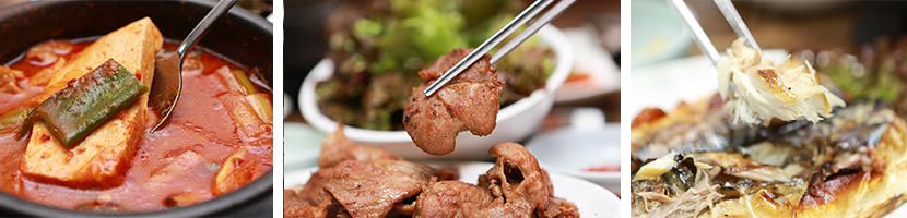 这家餐馆由社长于 2006 年 7 月创立,其初衷是希望更多人能品尝到从幼小时就钟爱的、百吃不腻的家庭料理。这里的定食套餐每日都会更换小菜,价格亲民,性价比极高。餐馆拥有 9 种人气定食,其中调味猪肉定食堪称一绝,售价 12,000 韩元 / 1 人份。调味猪肉作为招牌菜,带有微微的甜味,烹饪过程中需不停晃动锅具,确保肉均匀受热,同时保留肉汁,最后滴入几滴果汁,美味就此诞生。社长推荐的吃法是在生菜上放上炒好的猪肉和蒜,蘸上包肉酱后一口吃下,肉、蒜与酱的味道完美融合,令人陶醉。豆腐汤定食同样出色,价格为 10,000 韩元 / 1 人份。餐馆采用江原道・江陵草堂以海水制作的豆腐,搭配猪肉、新鲜的大葱、洋葱、松耳和泡菜,炖煮出的豆腐汤暖身又开胃。烤鱼定食也是传统人气料理之一,选用挪威产的青花鱼烤制而成,肉质适度,食客可轻松将鱼身分解享用,价格为 12,000 韩元 / 1 人份。除了主菜,套餐中还有每天更换的 4 种小菜、生菜、汤、煎鸡蛋、面条、米饭等附加菜可供自由享用。