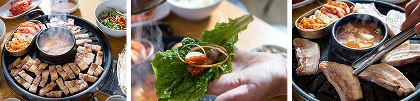 店内的人气菜品 “无限续添五花肉 + 大酱汤” 套餐,仅需 16,900 韩元 / 1 人,性价比超高。职员会先为顾客提供基本的猪肉、拌葱丝、切丝的洋白菜、一碗大酱汤、辣白菜和蘸料,并且无论是肉、大酱汤还是小菜,都可以无限续添。如果错开饭点去,贴心的服务员还会在一旁亲自帮顾客烤肉。在预热烤盘时,将辣白菜与拌豆芽放在铁盒里,随着烤盘温度的上升,配菜也会慢慢烤熟。接着在热好的烤盘上迅速放上鲜肉,肥厚的猪肉马上发出呲呲的声响,诱人的香味瞬间弥漫开来。等不及吃烤肉的朋友可以先喝点热汤暖暖胃,当肉的两面都烤至金黄,油汁滴得差不多时,烤盘中央的大酱汤也冒出滚滚热气,这时用剪子把五花肉剪成方便食用的大小,就可以尽情享受美味了。