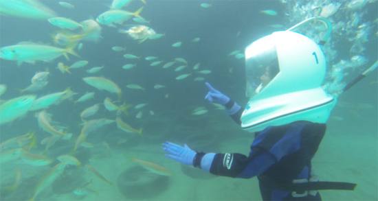 1.零门槛亲近海洋:无需潜水证、不会游泳也能参与,全程佩戴专业氧气头盔(重量轻、视野清晰,可正常呼吸),在水深 5-8 米的海域漫步,轻松接触海底世界,新手和亲子家庭友好。