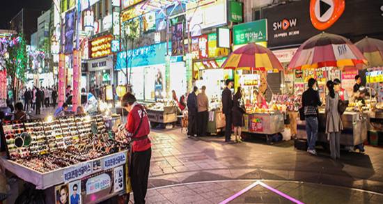 美食体验:广场上有众多小吃摊位,提供各种韩国特色美食,如种子甜饼、辣炒年糕、紫菜包饭、鱼饼串等,其中承基种子甜饼非常有名,深受游客喜爱