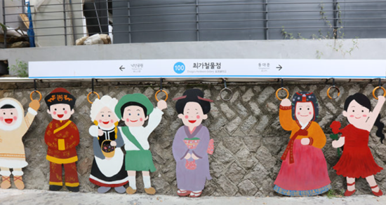 就这样,一幅、两幅、三幅…… 色彩逐渐铺满了梨花洞的巷弄。 如今走进梨花洞街头美术馆,仿佛踏入了一个没有边界的艺术空间:入口处的墙面上,画着憨态可掬的卡通人物与梨花洞的街景,用生动的笔触欢迎每一位访客;深入巷弄,既有充满童趣的 “动物乐园”—— 长颈鹿从屋顶探出头,小兔子在墙角啃胡萝卜,小熊坐在台阶上挥手,让孩子们忍不住驻足互动;也有充满文艺气息的 “生活场景画”—— 画中还原了梨花洞老居民的日常:老奶奶在门口择菜,老爷爷在巷口下棋,年轻情侣在树下聊天,每一幅都充满烟火气;更有融合韩国传统文化的作品 —— 穿着韩服的少女、传统韩式房屋的屋檐、民俗活动的场景,用艺术的方式传承着地域文化。 这些作品并非孤立存在,而是与街区的建筑、环境完美融合:有的画作利用房屋的窗户作为 “画框”,让窗外的实景与画中场景形成呼应;有的则顺着墙面的弧度创作,让画面更具立体感;甚至连路边的电线杆、消防栓,都被画成了卡通形象或艺术装置,成为街区的 “隐藏彩蛋”。